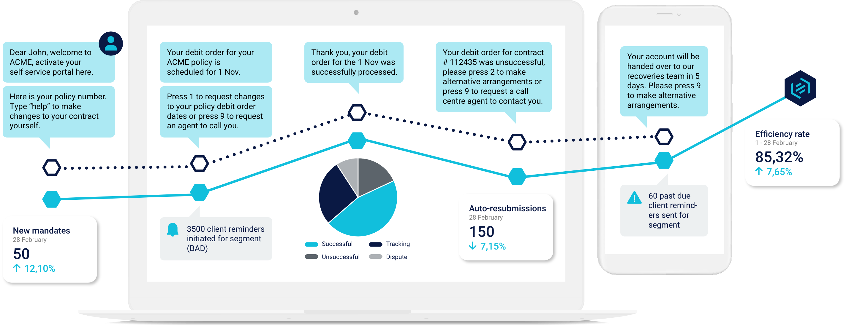 By seamlessly integrating with your ERP our collections engine processes debit orders through personalised interactions, leveraging machine-learned data to better understand customer behaviour.